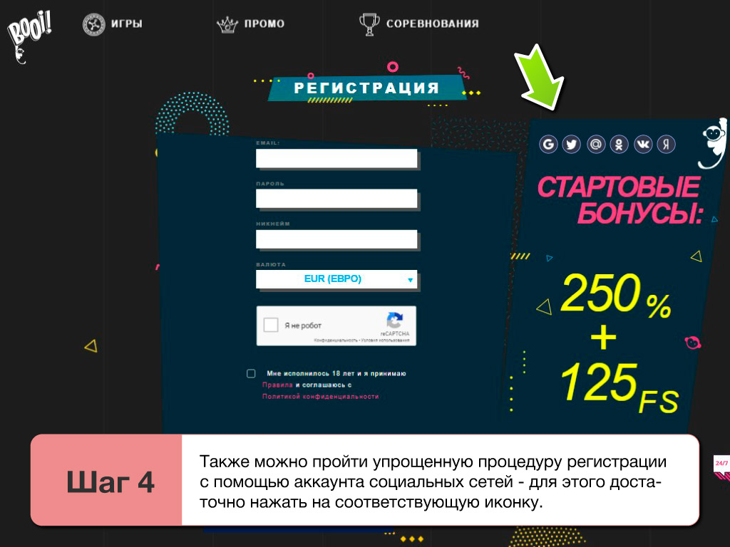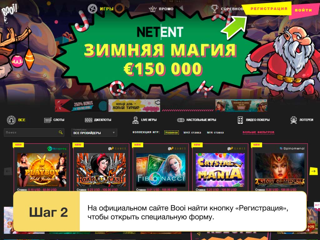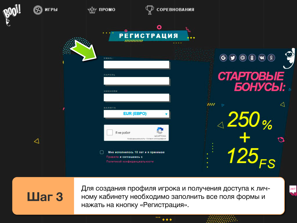 Чтобы играть на деньги в казино Booi в 2026 придется пройти простую процедуру регистрации. Без этого пользователям доступны только бесплатные демо режимы, которые здесь исключительно для ознакомления. Получить реальные выигрыши не выйдет, соответственно стоит сразу же вызывать форму для создания аккаунта. С ее помощью зарегистрироваться можно следующим образом: