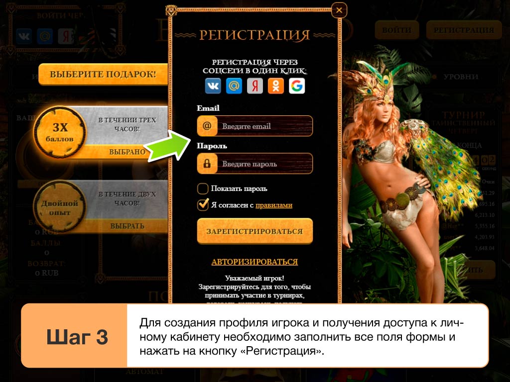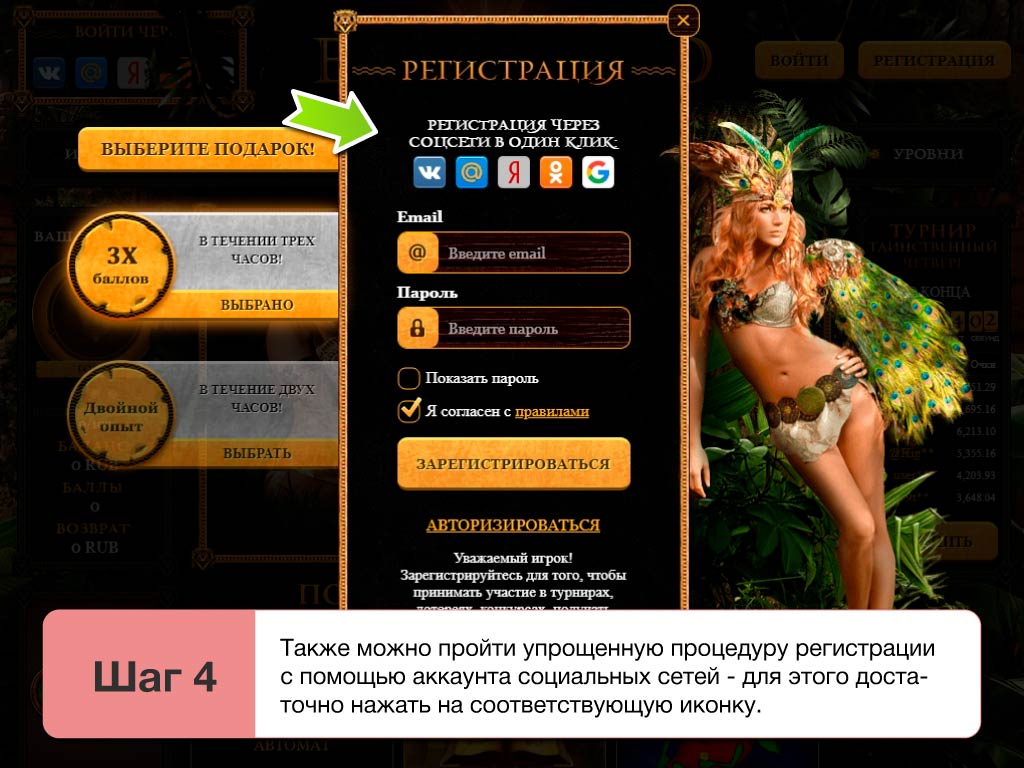 Платные версии игр от сайта Эльдоклуб в 2026 в любом случае станут доступны только после регистрации. Пользователи с аккаунтами в казино смогут привязать к ним свои счета и делать депозиты. В противном случае, придется довольствоваться только демо версиями. Чтобы зарегистрироваться достаточно сделать следующее: