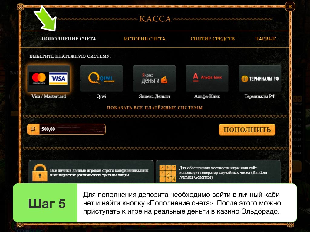 Главная причина, по которой стоит посетить Eldo Casino 2026 – это небольшие депозиты. Чтобы начать играть в ТОПовом казино на деньги достаточно закинуть на счет 100 рублей. Причем тут есть игры с большими коэффициентами, что позволит даже эту небольшую сумму превратить в хорошие выигрыши. Что касается поддержки платежных систем, то пополнить счет или вывести выигрыш можно следующими способами: