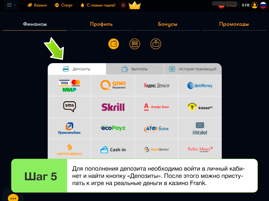 После ознакомления с характеристиками и функционалом игровых автоматов, можно играть на деньги, пополнив депозитный счет. Для игры на реальные деньги гости смогут использовать фриспины или бездепозитные бонусы, которые выдаются участникам турнирам или при активации номера телефона. В клубе можно получить бездеп бонус за повышение статуса в системе лояльности Франк казино 2026. Именинники имеют право на приятный бонусный подарок в свой День Рождения.