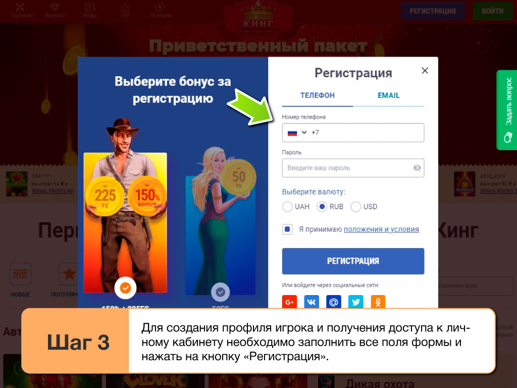 Необходимо зарегистрироваться, чтобы получить возможность играть на реальные деньги, активировать бонусы, наращивать статус. Для этого стоит кликнуть на регистрационную кнопку. Откроется форма, в строки которой потребуется ввести e-mail и телефонный номер, придумать уникальный пароль, определиться с игровой валютой. Слотокинг в 2026 году принимает универсальный доллар, рубль, гривну. Обязательный шаг - принятие правил и условий работы казино, а завершающий - клик на оранжевую кнопку "Регистрация". Позволяется входить на сайт с помощью партнерских социальных сетей: