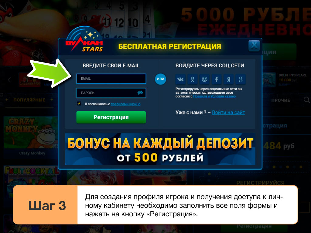 Чтобы получить полноценный доступ к сайту Vulcan Stars, новые пользователи должны выполнить условия регистрации в клубе 2026. Для этого нужно внести персональные данные в анкету, и подтвердить активацию аккаунта через ссылку, полученную в письме, поступившем на е-mail. Игроки могут использовать официальный сайт, а если он не работает — рабочие зеркала, чтобы зарегистрироваться на площадке. Посетителям казино, выполнившим процедуру регистрации, администрация Vulcanstars предоставляет без депозита приятный бездеп бонус на 500 рублей. С его помощью можно сразу начинать игру на реальные деньги.